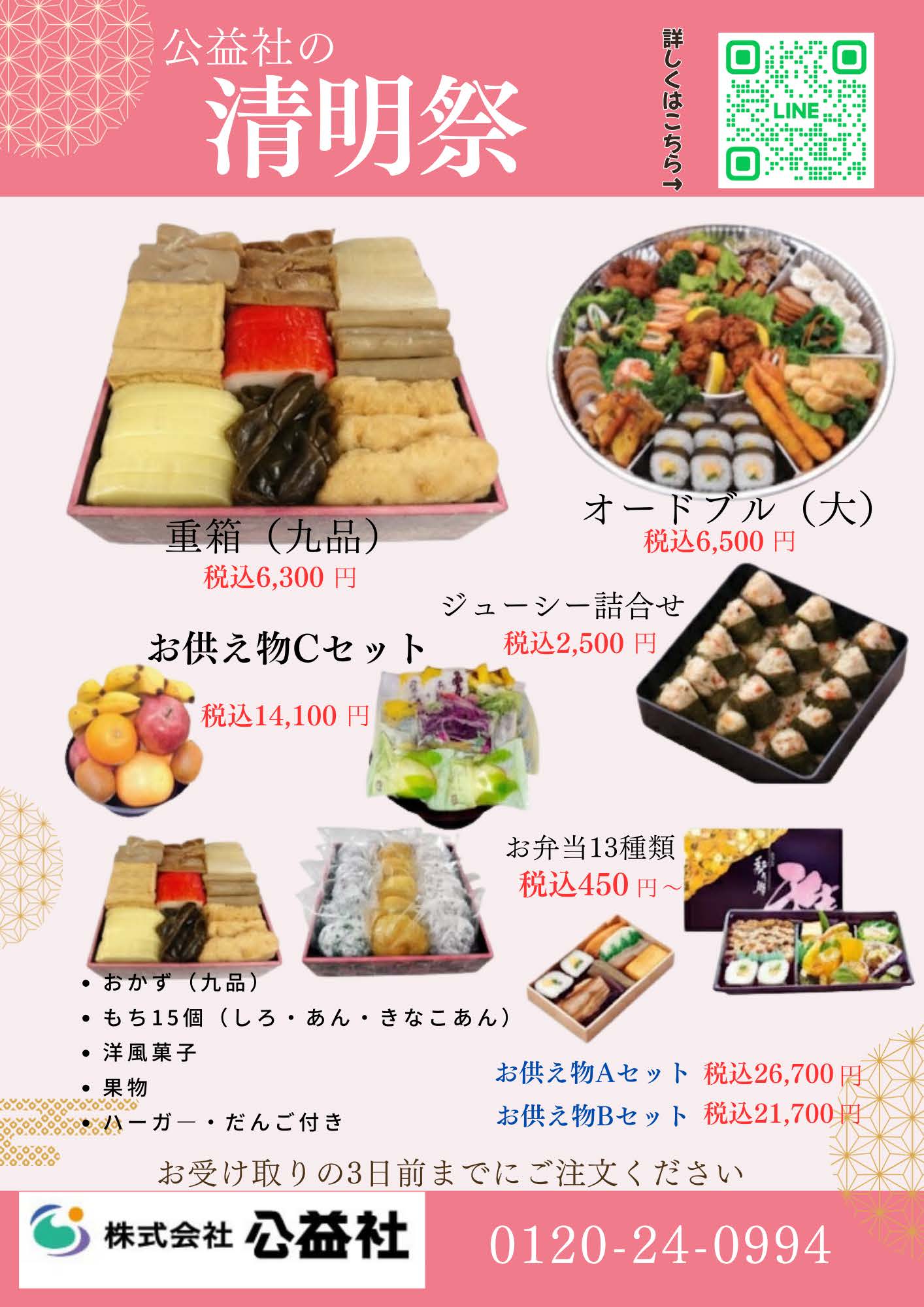 2026年 公益社『清明祭セット』のご案内 詳細 公開日:2026年03月15日(日)00:00 沖縄の一大行事、清明祭(シーミー)の季節がやってまいりました。公益社では、大切なご先祖様を敬い、親族が集う食卓を彩るための商品を豊富に取り揃えております。 詳しくはチラシ内にあるLINE公式アカウントからもご確認いただけます。期間限定にてクーポン配布中 ▶画像を拡大 次へ